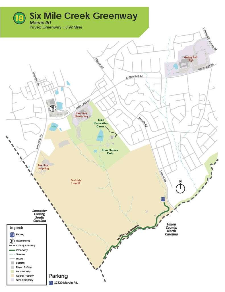Park in the lot on Johnston Road at the east end or a lot off Pineville-Matthews Road at the northwest end.