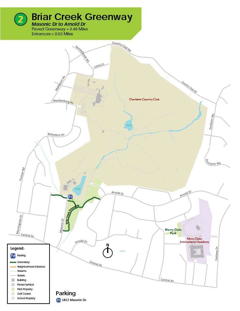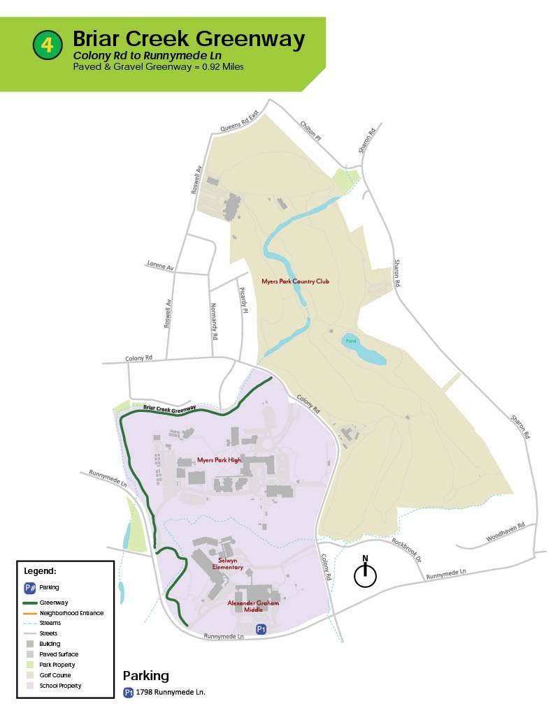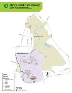 Briar Creek has two access points: Randolph Road near the Mint Museum, and Meadowbrook Road. The Randolph Road trailhead has plenty of free parking, whereas Meadowbrook Road is a residential street and parking may be limited.