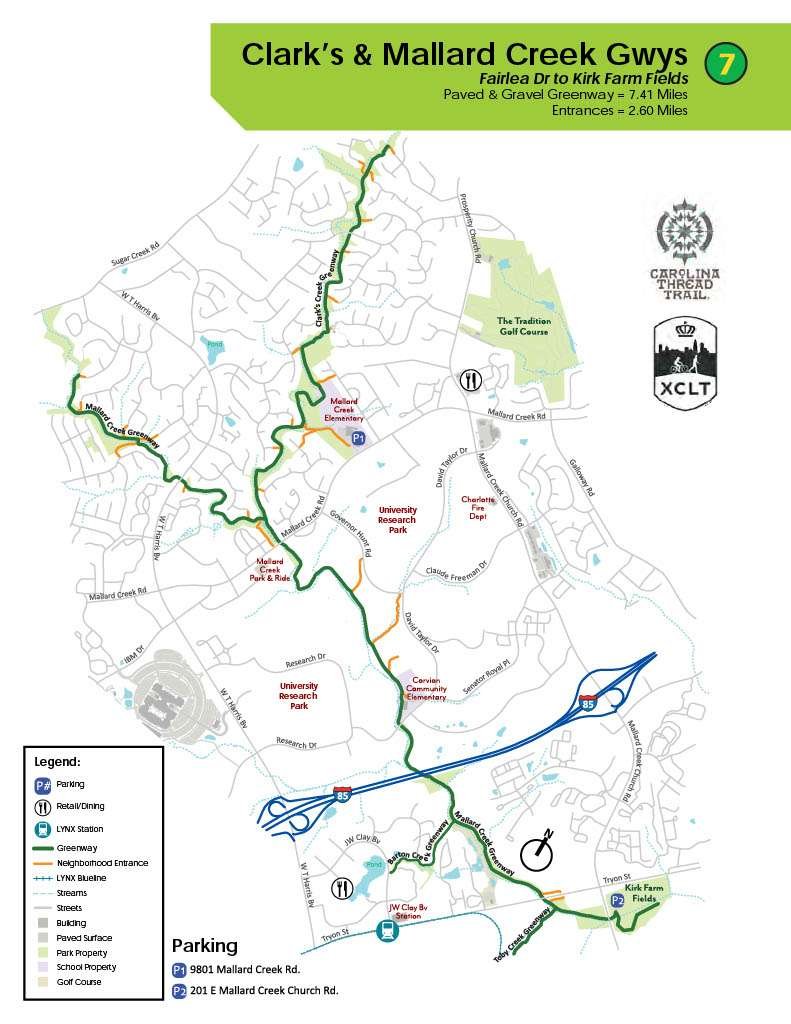 Both Mallard Greek and Clarks Creek Greenways feature a half-dozen connecting trails to neighborhoods. We recommend parking at the Winchester Playground or the TMSA Charlotte Secondary School near the Mallard Creek and Clarks Creek junction.