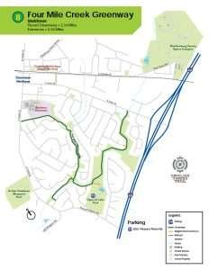Park near Ray’s Splash Planet to hop on Irwin Creek Greenway at the east end or at the end of S Bruns Ave, near Seversville Park to hop on at the west side on Stewart Creek Greenway.