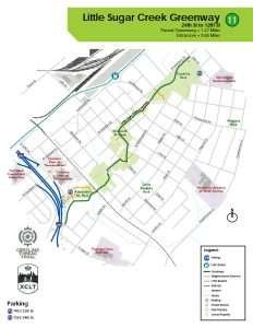 Little Sugar Creek Greenway is made up of five distinct sections and will feature more than 19 miles of trails when complete. Enjoy paved trails through forested areas and along Little Sugar Creek for a gentle or brisk walk, and bring your dog for company! Currently, the five sections are Cordelia Park to 12th Street, East 7th Street to Morehead Street, Morehead Street to Brandywine Road, Tyvola Road to Huntingtowne Farms Park and Huntingtowne Farms Park to I-485.