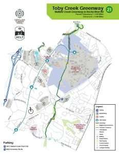 For Hoover Creek Greenway we recommend parking in front of the shopping center and walking around the building to access the trail. Park at Best Buy to access the trailhead for Walker Branch Greenway.
