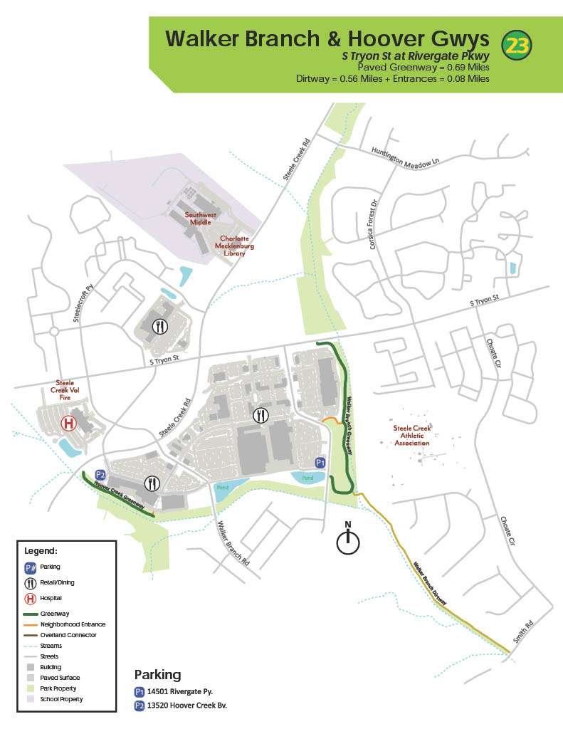 Walker Branch Greenway is a 1.9-mile out-and-back off South Tryon Street behind the Rivergate Mall. It has a handful of trailheads from the shopping area’s parking lot and nearby neighborhoods. Hoover Creek Greenway is on the other side of the Rivergate Mall running behind the Ulta, Home Goods and Kohl’s. Despite being close to each other, these greenway trails are not connected.